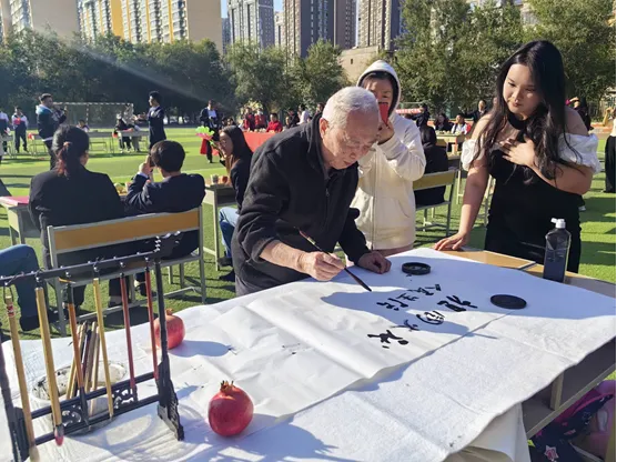 此外,活动还特别安排了书法展示活动。老师们挥毫泼墨,书写着对祖国的祝福和美好愿景。他们的作品笔触流畅、气势磅礴,让师生近距离、面对面感受传统文化的魅力。