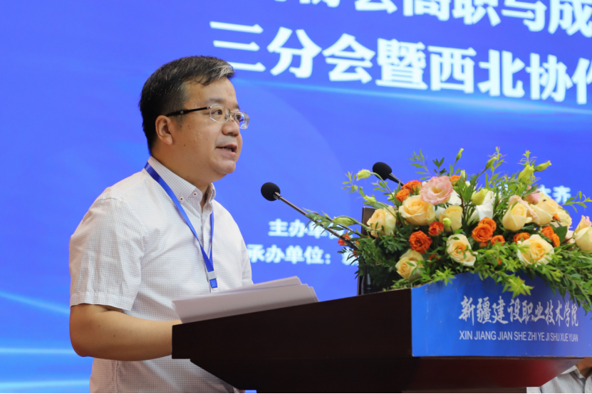 四川建筑职业技术学院党委办公室主任蒋鹏飞代表三分会主任李辉讲话,他指出,三分会始终坚持重心下沉、求真务实的活动原则,始终立足西部地区经济社会发展实际需求,开展了大量卓越有效的合作,在各会员单位之间搭起了沟通的桥梁,建立了交流的平台,维系了情感的纽带。他强调,本次年会的召开,将进一步深入学习贯彻习近平总书记关于职业教育的重要指示精神,汇聚各方智慧,整合各方资源,畅通沟通渠道,学习先进经验,聆听专家指导,探索发展思路,实现共同进步。