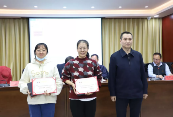(学院党委委员、副院长石建平为荣获新beat365中文唯一官网首届“金笔建院”优秀信息员银笔奖的俞婷、刘玲玲同志颁奖。)