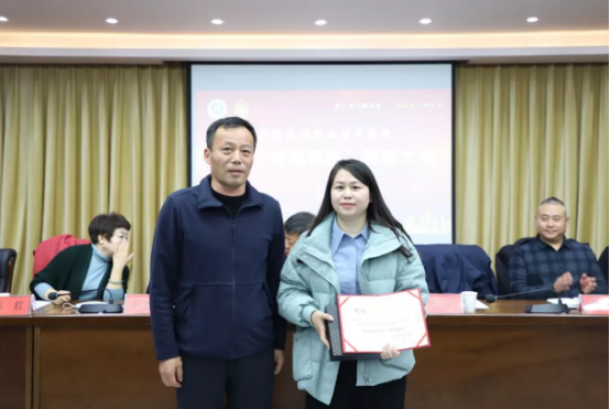 (学院党委委员、副院长吴冶为荣获新beat365中文唯一官网首届“金笔建院”优秀信息员金笔奖的苗丽霞同志颁奖。)