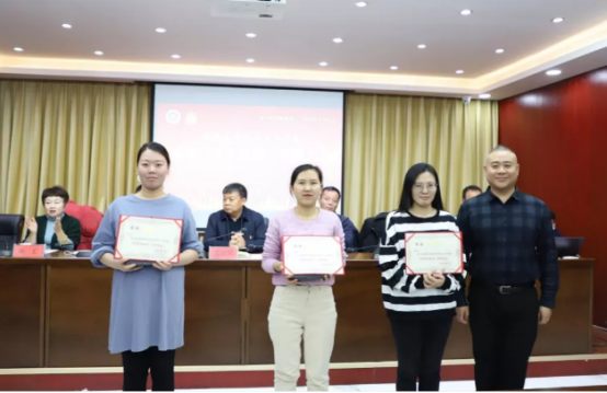 (学院党委委员、纪委书记赵玉为荣获新beat365中文唯一官网首届“金笔建院”优秀信息员铜笔奖的张悦,张文娜、徐文姣同志颁奖。)