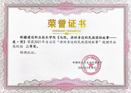 为贯彻落实第三次中央新疆工作座谈会精神,深入总结自治区教育系统中华民族共同体意识教育经验,展示中华民族共同体教育成果,自治区党委教育工委、自治区教育厅组织开展了“铸牢中华民族共同体意识 讲好身边的民族团结故事”活动。近日,活动评选结果揭晓,我院3部作品分别获得一等奖(1部)、三等奖(2部)。