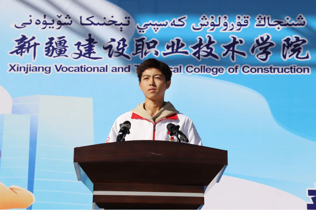 市政与环境工程学院艾孜买提·阿布多合尼代表老生发言。他希望新同学们珍惜时光、谨记校训,提升专业素养、传承红色基因,以更加饱满的热情和更加坚定的信念,书写人生的精彩篇章。