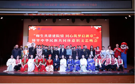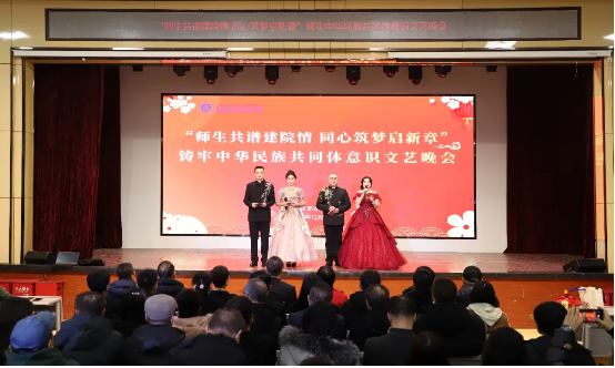 时光荏苒,岁月如梭,在这辞旧迎新的美好时刻,12月31日下午,学院“师生共谱建院情 同心筑梦启新章”——铸牢中华民族共同体意识文艺晚会在建材校区隆重举行,学院党委副书记、院长党进,党委副书记、副院长马桂珍,党委委员、纪委书记赵玉,副院长余冬贞,及高新区(新市区)委政法委、党委宣传部意识形态和审读工作办公室,高新区(新市区)维稳指挥中心、银川路街道党工委、杭州路街道、杭州路派出所、上八家户社区、西八家户社区等有关领导出席,600余名师生参加了活动。 晚会由舞蹈、朗诵、小品、舞台剧、手势舞、歌曲(独唱)、情景舞蹈、舞蹈串烧等14个节目组成,200余名教师和30余名学生同台演出,多种艺术展现形式轮番上演,融合中华优秀传统文化与现代文化,充分展示了我院丰富多彩的校园文化生活,营造出“以美育人、以文化人”的浓厚氛围,为观众带来一场视听盛宴。