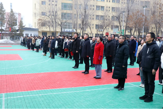三校区师生齐聚操场,列队有序。国旗护卫队步伐铿锵有力,护送鲜红的五星红旗入场。伴随着雄壮的国歌声,五星红旗冉冉升起,全体师生肃立行注目礼,大声齐唱国歌。