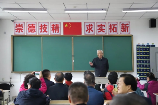 粉笔灰在阳光下轻盈飞舞,当年的班主任眭福春老师的手在黑板上写下“第一课”三个遒劲的仿宋字。这个熟悉的动作仿佛触发了时空的开关——四十年光阴瞬间倒流,鬓角染霜的校友们齐刷刷挺直腰板,他们中,有人需戴上老花镜才能看清板书,却在讲台上传来那声熟悉的咳嗽时,瞬间变回了当年在绘图板前熬夜的年轻人。